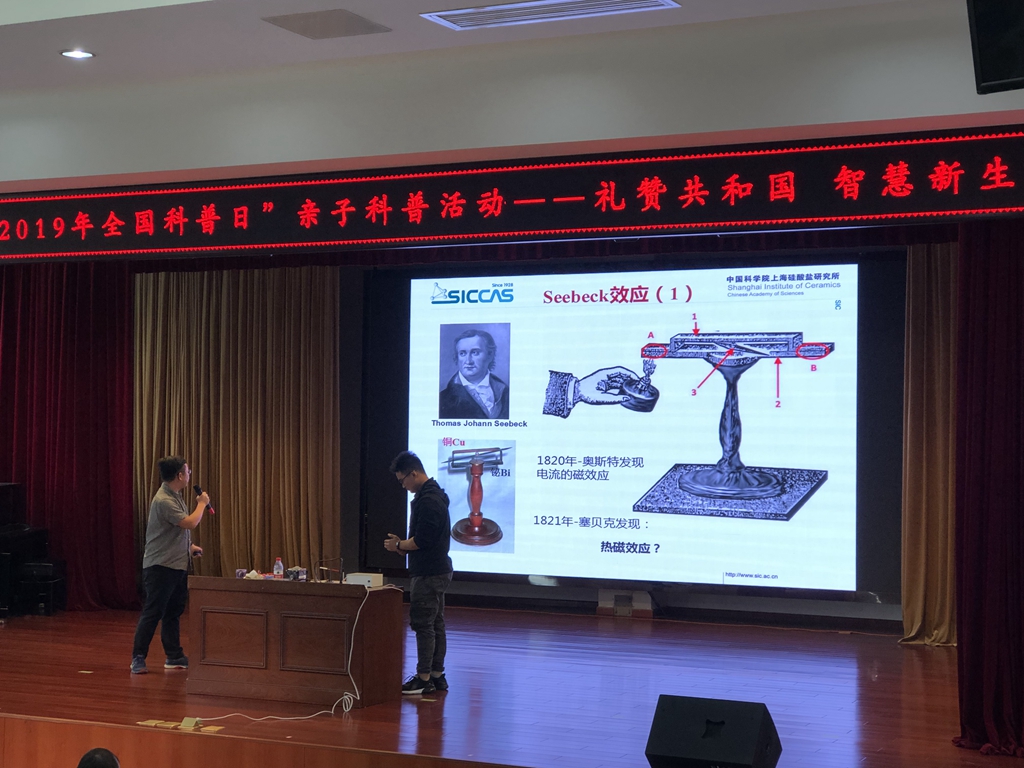 上海硅酸盐所在读研究生刘欣、田丰表演了科普舞台剧“明明可以靠颜值,却偏要拼才华——神奇的透明陶瓷”,用自己设计的道具,以幽默诙谐的形式介绍了透明陶瓷实现透明的内在机制,加深了学生对光学知识的理解;梁家晟、杨世琪用冰箱的致冷设备改装了温差发电体验装置,表演了科学实验秀“冰与火之歌——热电起源”,邀请现场观众上台体验体温发电驱动风扇、电能转化成温差使水结冰。