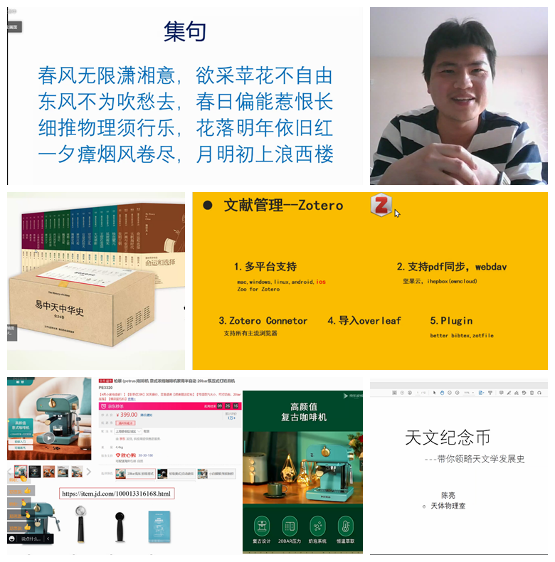 在“推荐你的最爱”比赛环节,6位职工和4位研究生热心分享他们的“最爱好物”,涉及了提升工作效率的各类科研软件、好书、电影、健身技巧和美食等多个种类。上海天文台青促会负责人、天文地球动力学研究中心的许雪晴研究员推荐《易中天中华史》,强调学史读史的重要性,鼓励大家“学史明理、砥砺前行”,通过学习历史,开阔眼界,完善自身,助力科研。天体物理研究室的闫震副研究员推荐了Zotero、Linux版本WSL2等有用的软件;陈亮研究员带来的天文纪念币,带领大家进行了一次天文学发展史之旅;陈力研究员推荐了一款好用不贵的咖啡机。天文地球动力学研究中心的张益泽副研究员推荐了掌上办公利器——坚果云及代码编辑器,并详细介绍了坚果云强大的云同步功能。党政办公室副主任左文文推荐了居家健身动作与器材,并录制了视频带领大家一起运动。研究生上官伟华推荐了iMuseum软件和“四维看展”小程序,帮助同学们了解关于博物馆展览咨询,足不出户也能看到各种展览,丰富自我的业务生活;李志辉推荐了k系列剧本杀,为大家在封控期间工作之余的娱乐生活提供了一种新方式;丁君生推荐了个人博客,汇集了编程技巧、科研报告注意事项等各类经验总结;罗秋怡推荐了徐家汇园区周边的各种美食,让大家对解封后的生活更加充满期待。
