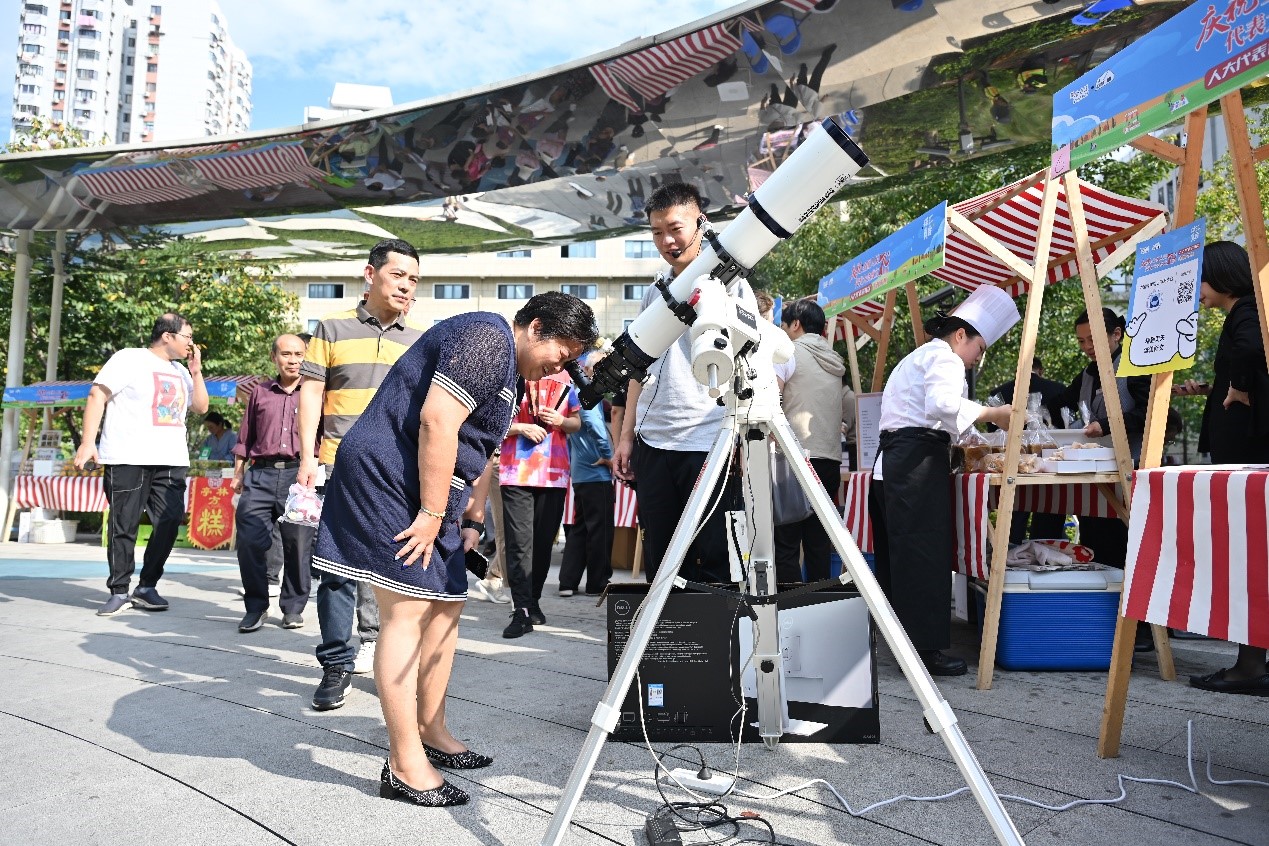 我台在摊位上架设望远镜,通过赤道仪自动跟踪技术,为社区居民提供了一个独特且意义丰富的观测太阳的机会。目前太阳活动正进入极大期,太阳表面出现较多黑子,当居民朋友通过望远镜观察到太阳黑子时,不禁发出惊奇的赞叹,通过和我台工作人员的交流和互动,居民朋友们不仅了解了观测到的目标天体太阳黑子,增长了天文知识,还激发了居民朋友对天文学的兴趣和好奇心。