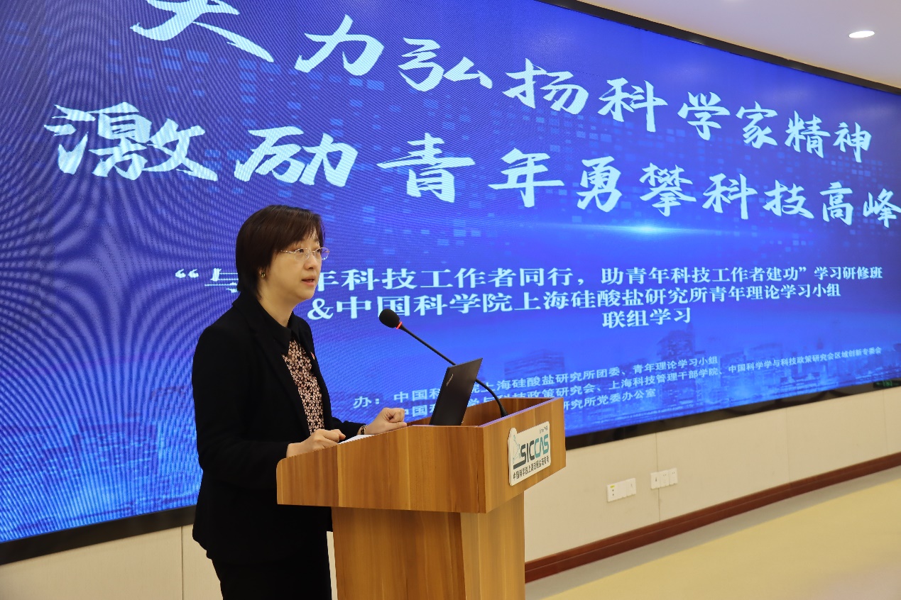 11月6日上午,由中国科协学会服务中心立项支持、中国科学学与科技政策研究会举办、上海科技管理干部学院承办的“与青年科技工作者同行,助青年科技工作者建功”学习研修班赴中国科学院上海硅酸盐研究所嘉定园区,同上海硅酸盐所青年理论学习小组开展联组学习。此次联组学习以“大力弘扬科学家精神,激励青年勇攀科技高峰”为主题,设置了参观基地、观看电影、主题报告、交流研讨四个环节。上海科技管理干部学院(上海科学技术政策研究所)副所长、中国科学学与科技政策研究会区域创新专委会秘书长郝莹莹主持活动。上海硅酸盐所党委办公室主任、所办公室主任毛朝梁,研修班和所青年理论学习小组70余人参加学习活动。此次联组学习由上海硅酸盐所党委办公室指导,所团委、青年理论学习小组连同中国科学学与科技政策研究会、上海科技管理干部学院、中国科学学与科技政策研究会区域创新专委会共同主办。当天还开设了在线直播,以扩大学习覆盖面和灵活性,青年理论学习小组“外派组”等在外挂职的成员,以在线方式参加学习。
