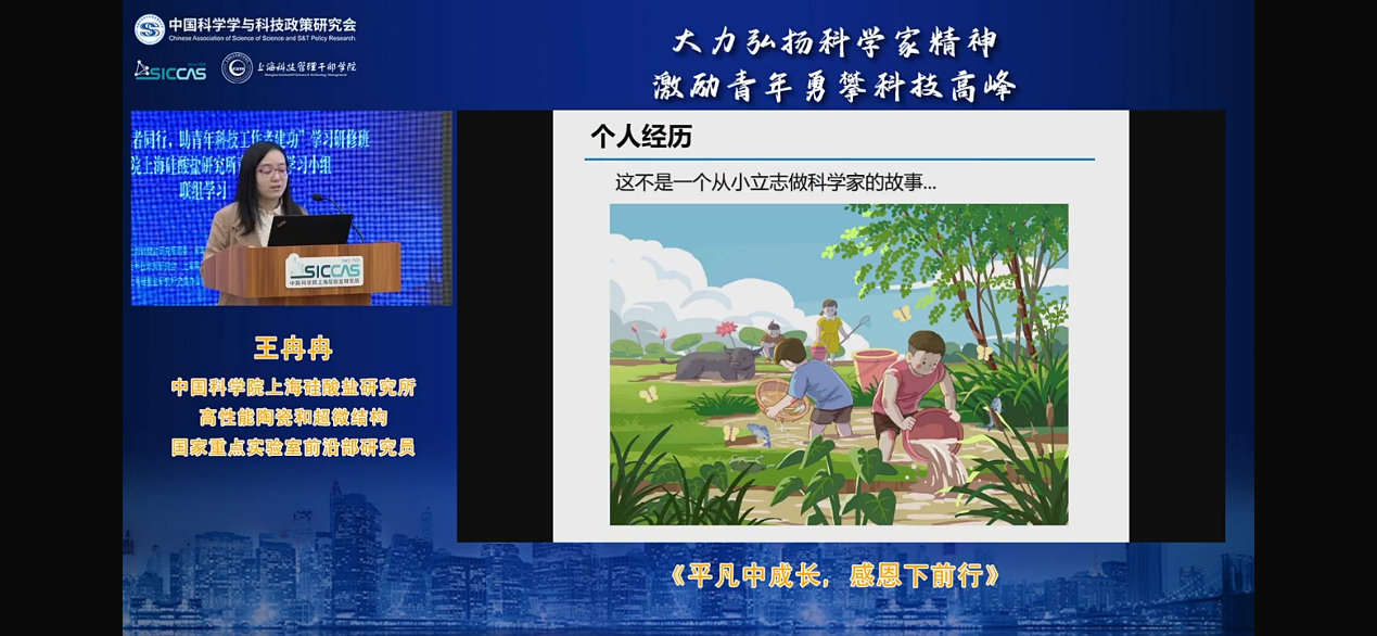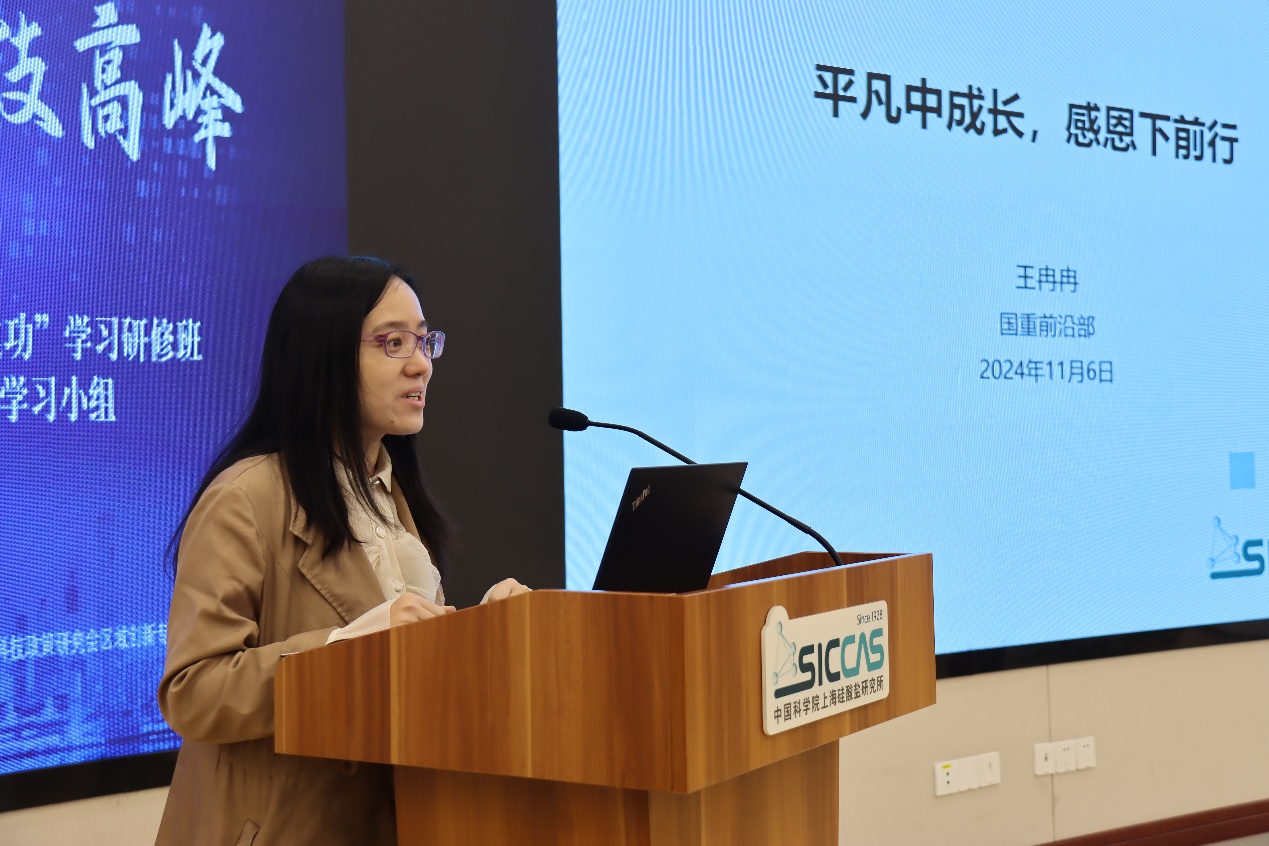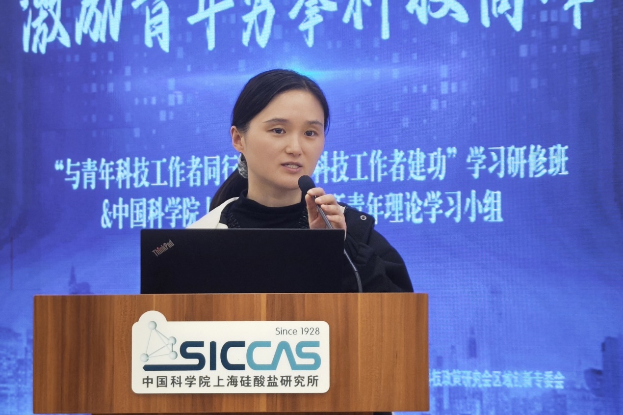 在主题报告环节,上海硅酸盐所高性能陶瓷和超微结构国家重点实验室研究员王冉冉作为上一期青年理论学习小组成员代表,作了题为“平凡中成长,感恩下前行”的个人分享报告。她从学业、事业到生活家庭,分享了成长经历,鼓励青年科技工作者面对挫折和困难时,认真做好眼前的事,同时要勇于尝试突破自我。