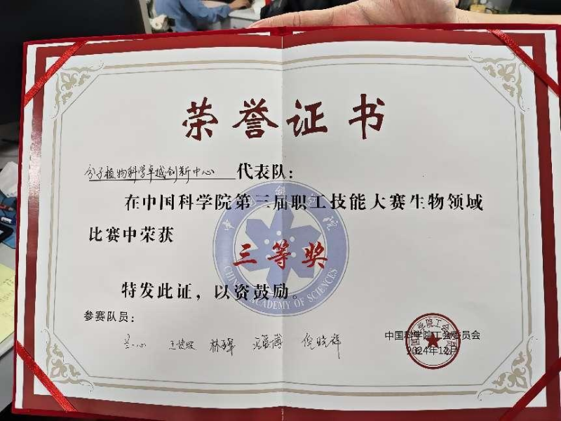 王婕琛:我2003年进所读博,2007年博士毕业留所工作,至今已经工作17年,人生最美好的时光留在了这里。生物是一门实验的学科,磨练实验技能是我们永恒的追求。我很荣幸代表我们中心第一次参加职工技能大赛。我也很自豪,代表我们中心拿到了植物类实验最佳操作奖。人会变老,但心态可以长青,常学常新,紧跟时代新技术潮流。我们中心5人代表组,除了我之外都是90后的年轻博后,我们一起获得了团队三等奖。在他们身上,我看到了蓬勃向上的朝气,扎实的基本功,热爱科研的心态。我们一起获得了团体三等奖。在核心技术展示环节,还学习到了其他院所的先进技术和成果,深受启发。