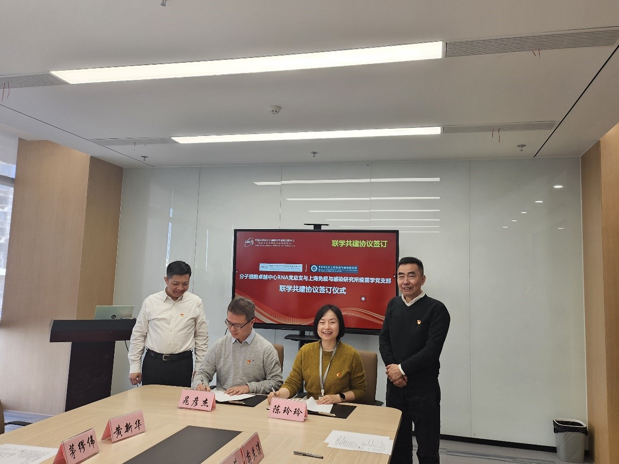 双方在共同参观了分子细胞科学卓越创新中心闵行基地实验室、公共技术平台后开展深入座谈交流。座谈会上,双方代表分别介绍了本单位科研工作进展和未来发展计划,并围绕“如何加强双方在疫苗学领域的科研合作与攻关”展开了热烈讨论。参会人员积极发言,从各自的研究领域出发,探讨了合作潜力、可能的研究方向以及未来发展方向等。在双方党员代表的共同见证下,陈玲玲、晁彦杰共同签署了结对共建协议,开启携手并进新篇章。