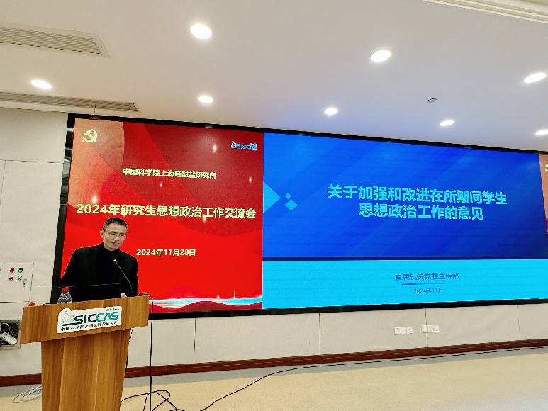 为深入贯彻党的二十大精神和习近平总书记对学生思政工作作出的重要指示精神,贯彻落实中国科学院党组对研究生教育工作作出的部署要求,11月28日,中国科学院上海硅酸盐研究所召开2024年研究生思想政治工作经验交流会,党委书记王东出席会议并讲话。中国科学院上海分院综合办公室主任朱熊出席会议,研究生思想政治工作领导小组成员、导师代表、专兼职辅导员、研究生部人员、所团委相关委员、研究生党支部支委、研究生团支部支委、班级班长、研究生会负责同志、融媒体中心负责同志等七十余人参加会议,会议由副所长史迅主持。