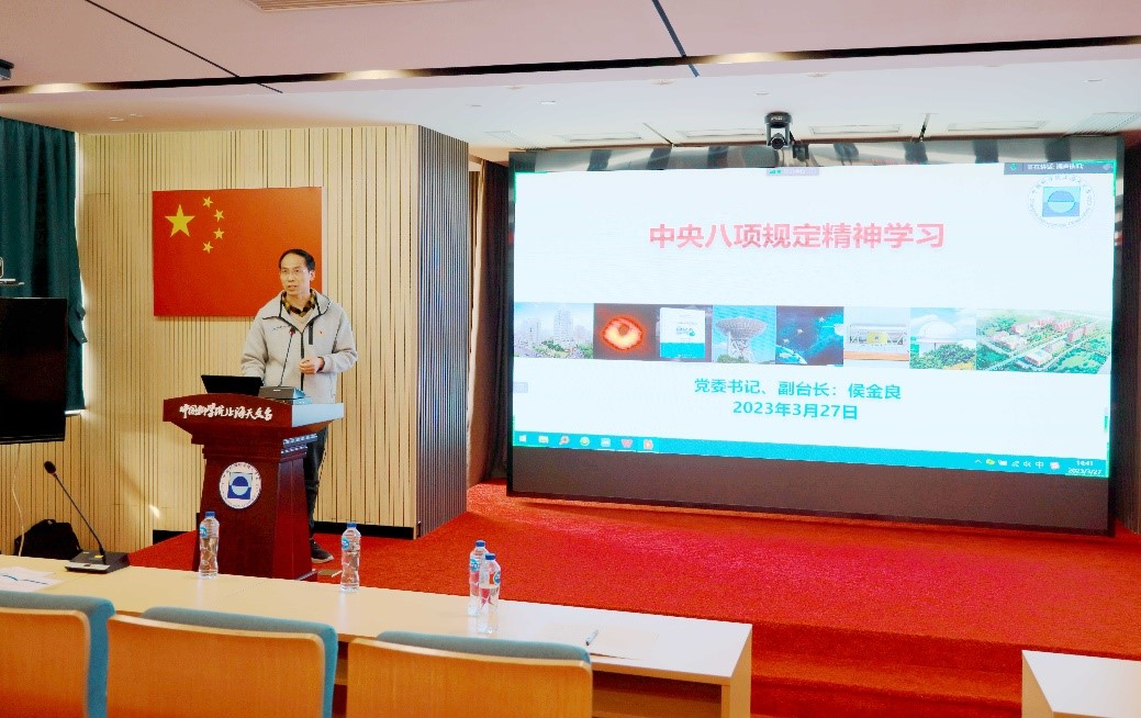 侯金良领学了《中共中国科学院党组贯彻落实中央八项规定精神实施办法》,并作“中央八项规定精神学习”辅导报告。他要求全台党员干部职工和研究生在日常科研与管理工作中,深入学习贯彻党的二十大精神,落实新时代党的建设总要求,健全全面从严治党体系,严格贯彻落实中央八项规定精神,坚持以严的基调强化正风肃纪,不断推进作风建设常态化长效化。