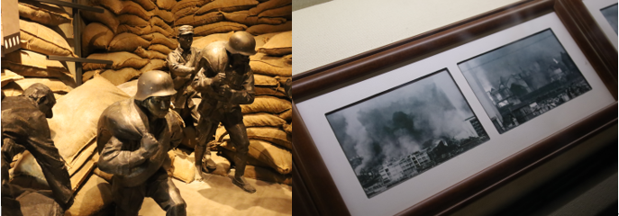 弹痕犹在,英魂不朽。四行仓库保卫战,是上海“八一三淞沪抗战”中最后的战场。在晋元纪念广场上,满目苍夷的四行仓库纪念馆西墙以累累弹痕无声述说着中华民族浴血奋战的悲壮历史。展厅通过实物展品、巨幅雕塑、战斗场景蜡像等生动再现了在抗日民族统一战线旗帜下和全面抗战的背景下,上海人民投身全民族抗战、共御外侮的历史岁月和孤军奋战、顽强坚守的“八百壮士”的英雄事迹。