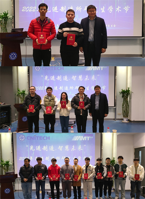 来自先进制造所6个团队的26名学生分别从研究背景、研究现状、研究进展和研究成果等多个方面进行了全方位、多维度的详细汇报,与评委和同学们展开了深入交流,给在场的嘉宾和同学们留下了深刻印象。评委就科研进展、报告质量、答辩表述三部分,对研究生的整体素质进行了较为全面的考察与打分。最终,经过四个小时的激烈角逐,两个分会场共评选出一等奖两名、二等奖4名以及三等奖9名,先进制造第一党支部书记张驰与机械工程教研室副主任陈思鲁为获奖者颁发荣誉证书。