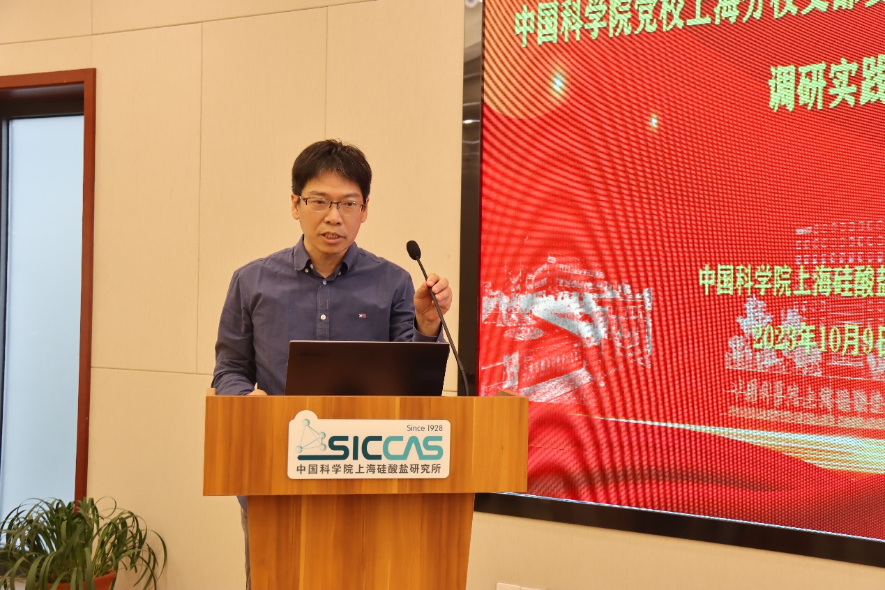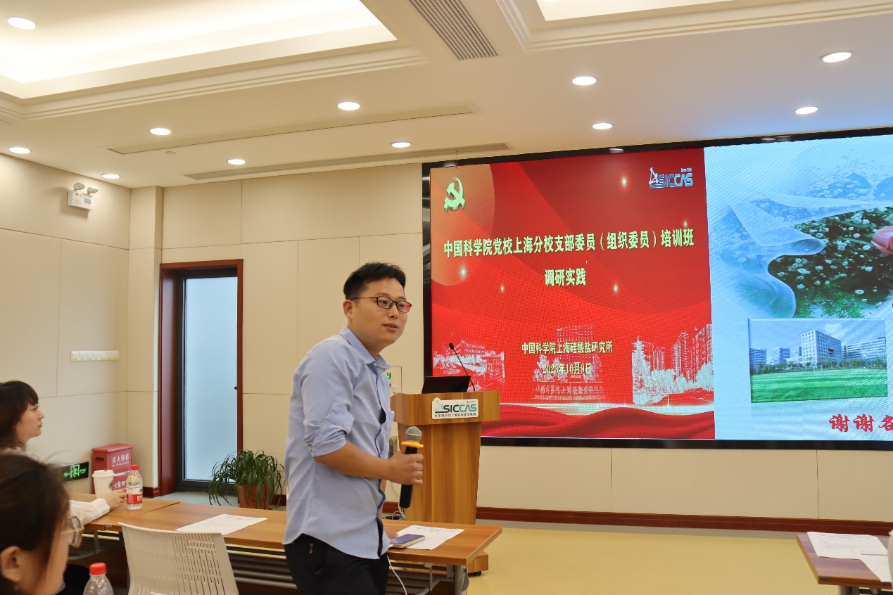10月9日下午,中国科学院党校上海分校支部委员(组织委员)培训班赴中国科学院上海硅酸盐研究所开展实地调研实践,并举行座谈交流会。上海分院人力资源部组织干部处副处长刘晓平、上海硅酸盐所党委办公室(所办公室)副主任陆贝妮、信息功能材料与器件研究中心副主任林慧兴,以及信息功能中心党支部书记、副主任曾华荣,特种涂层研究中心党支部书记孟佳等同志参加了座谈会,座谈会由刘晓平主持。