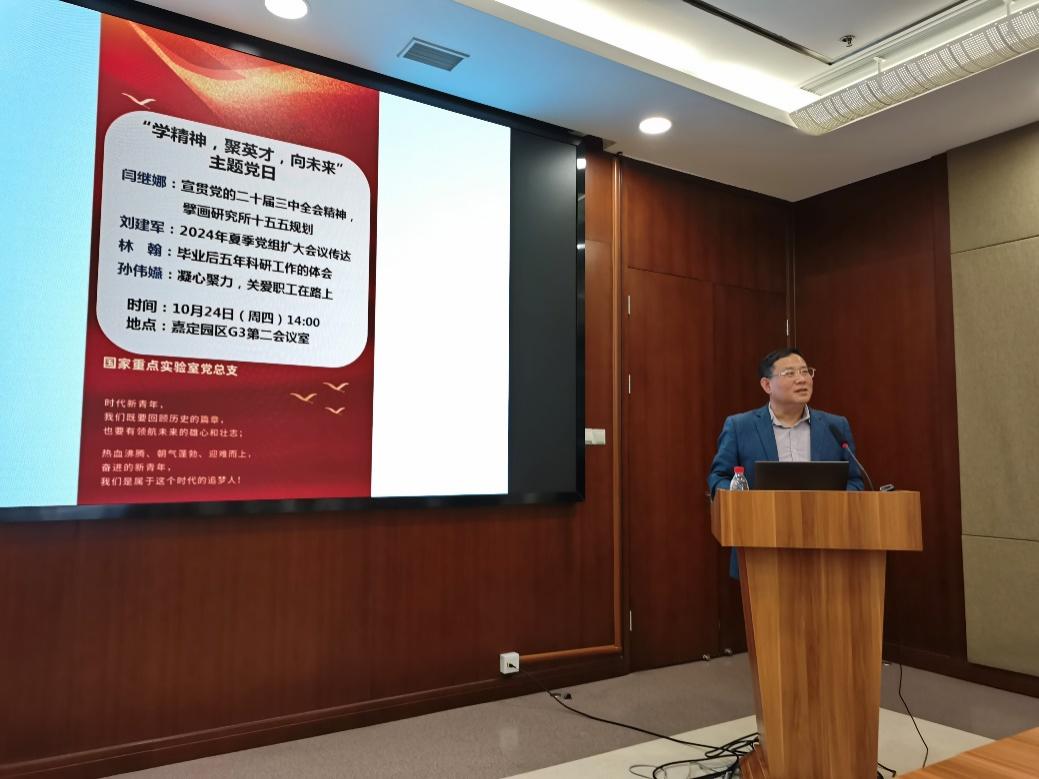 党总支副书记刘建军传达了院党组2024年夏季扩大会议精神,表示要加强党的全面领导,确保进一步全面深化科研院所改革始终沿着正确政治方向前进,为加快抢占科技制高点提供强大动力。