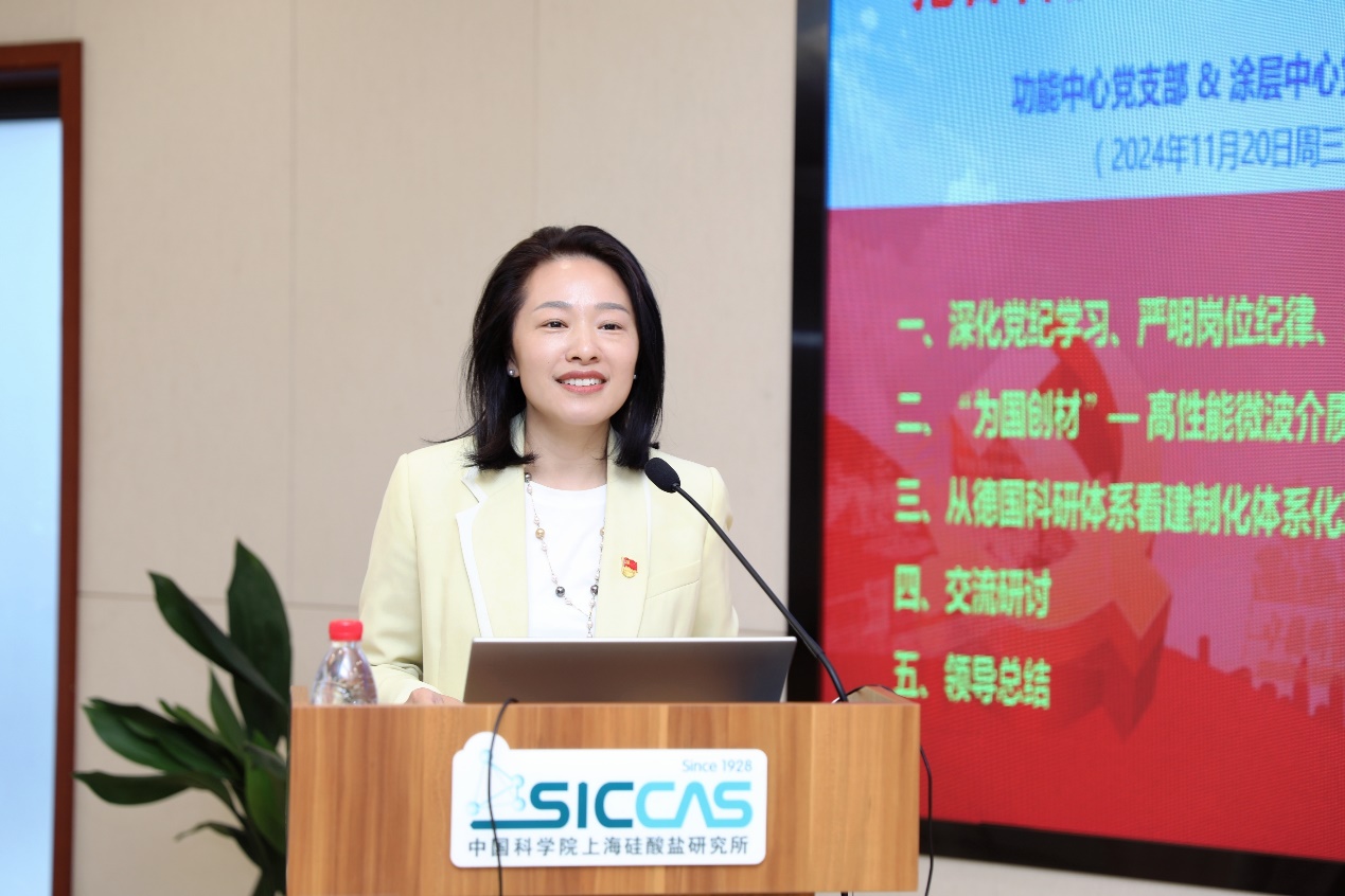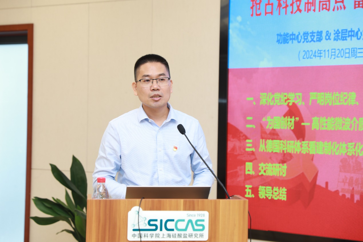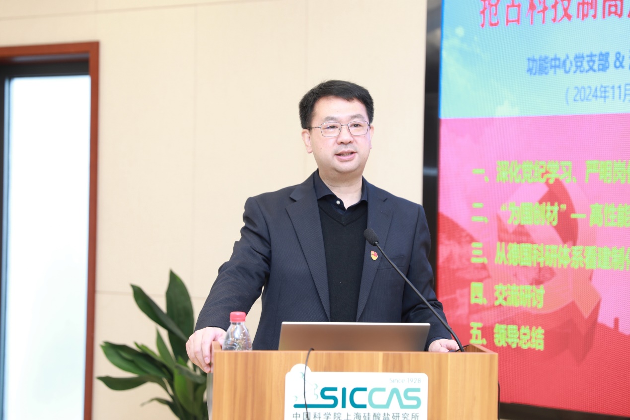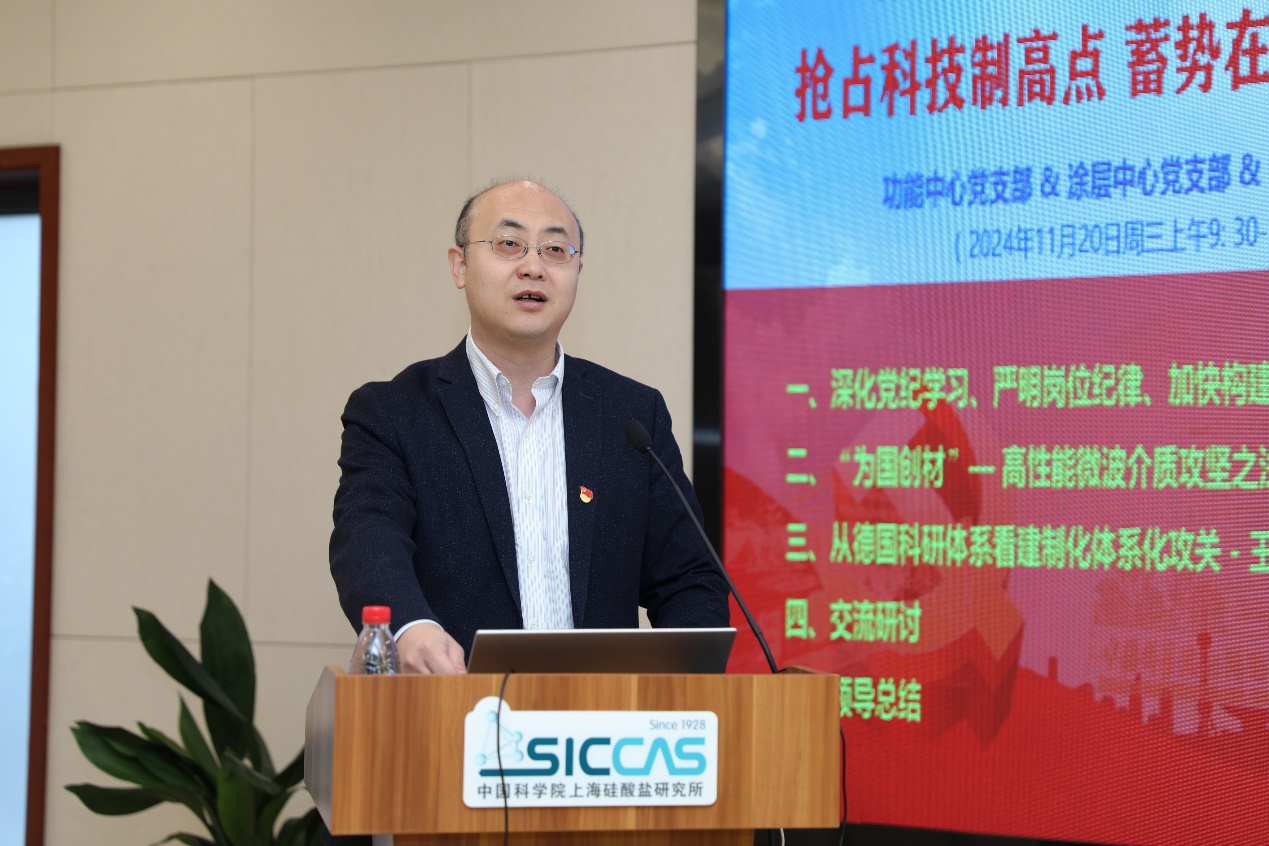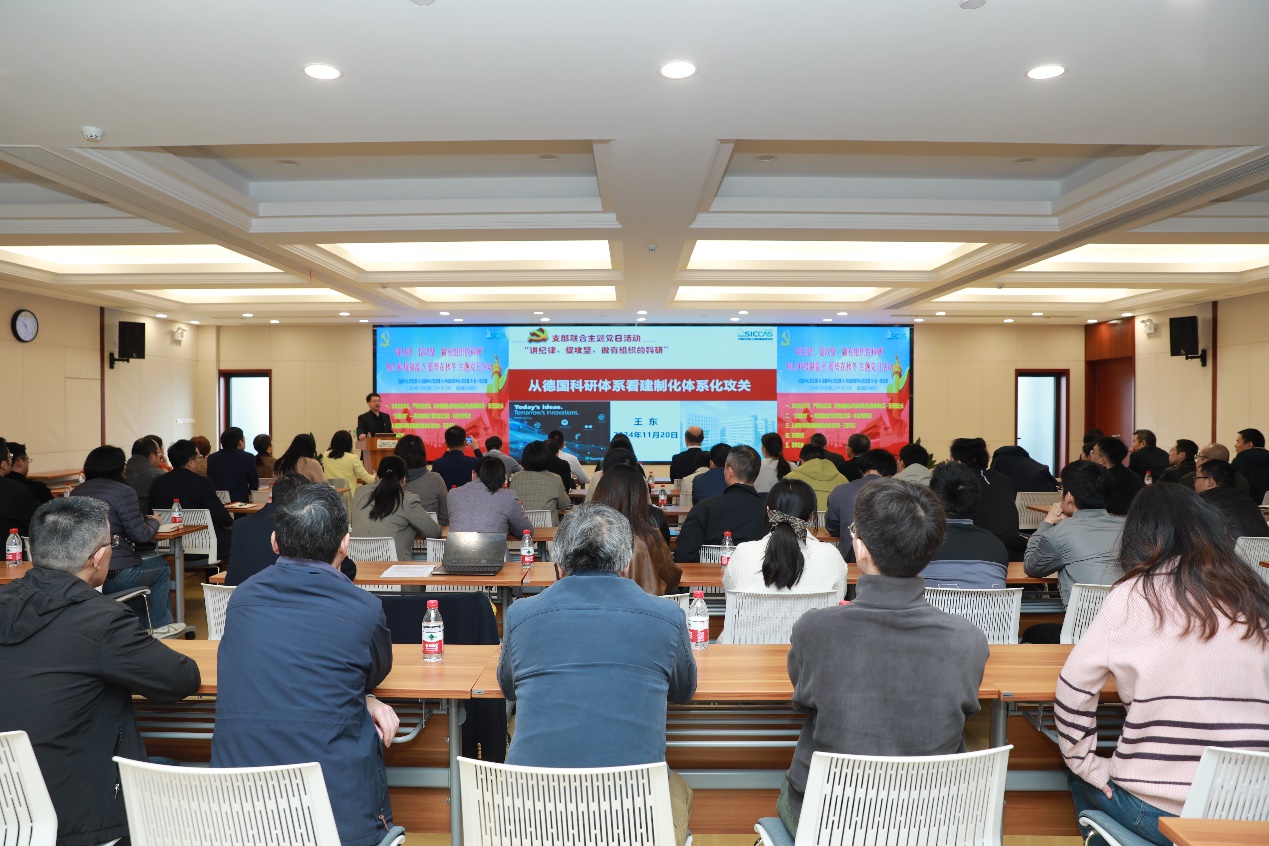 11月20日上午,中国科学院上海硅酸盐研究所信息功能材料与器件研究中心党支部、特种无机涂层研究中心党支部、新材料中试研发中心党支部和机关第一党支部联合开展“抢占科技制高点,蓄势在秋冬——讲纪律、促攻坚,做有组织的科研”主题党日活动,党委书记王东及支部党员100余人参加。活动由中试研发中心党支部书记袁兰英主持。