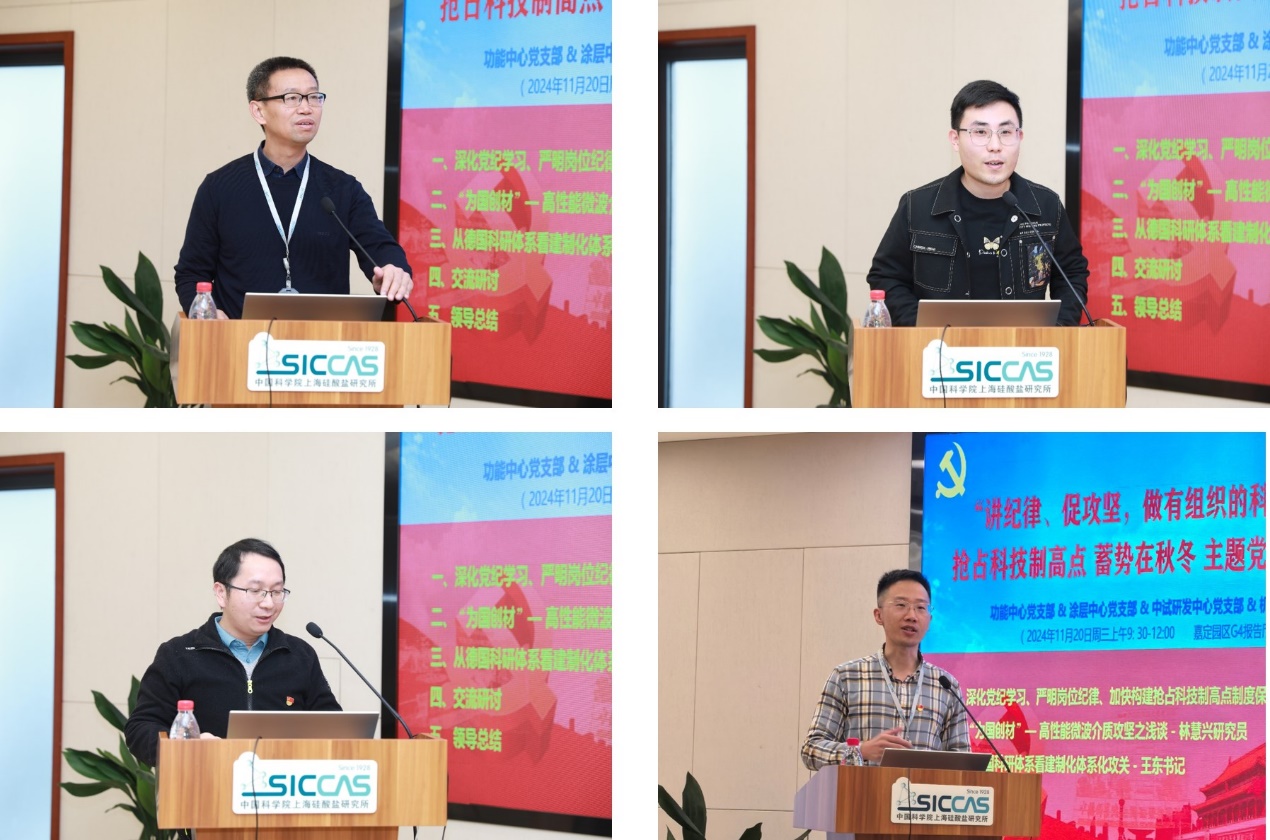 纪委委员、信息功能中心主任王根水,青年理论学习小组成员、特种涂层中心党员李昊耕,中试研发中心党支部副书记、副主任朱勇,所团委书记、机关第一党支部党员仲鹤分别结合自己工作实际作交流发言。大家表示,要进一步严守工作纪律要求,紧紧围绕抢占科技制高点核心任务,振奋精神、只争朝夕,切实肩负起国家战略科技力量使命担当,讲纪律、促攻坚,做有组织的科研,努力推动产出高质量攻坚成果。