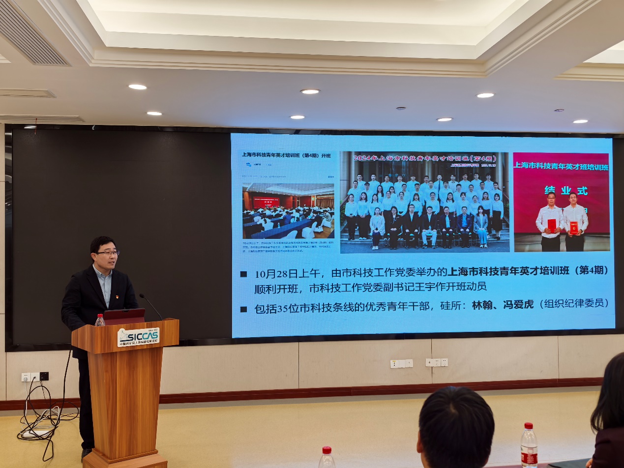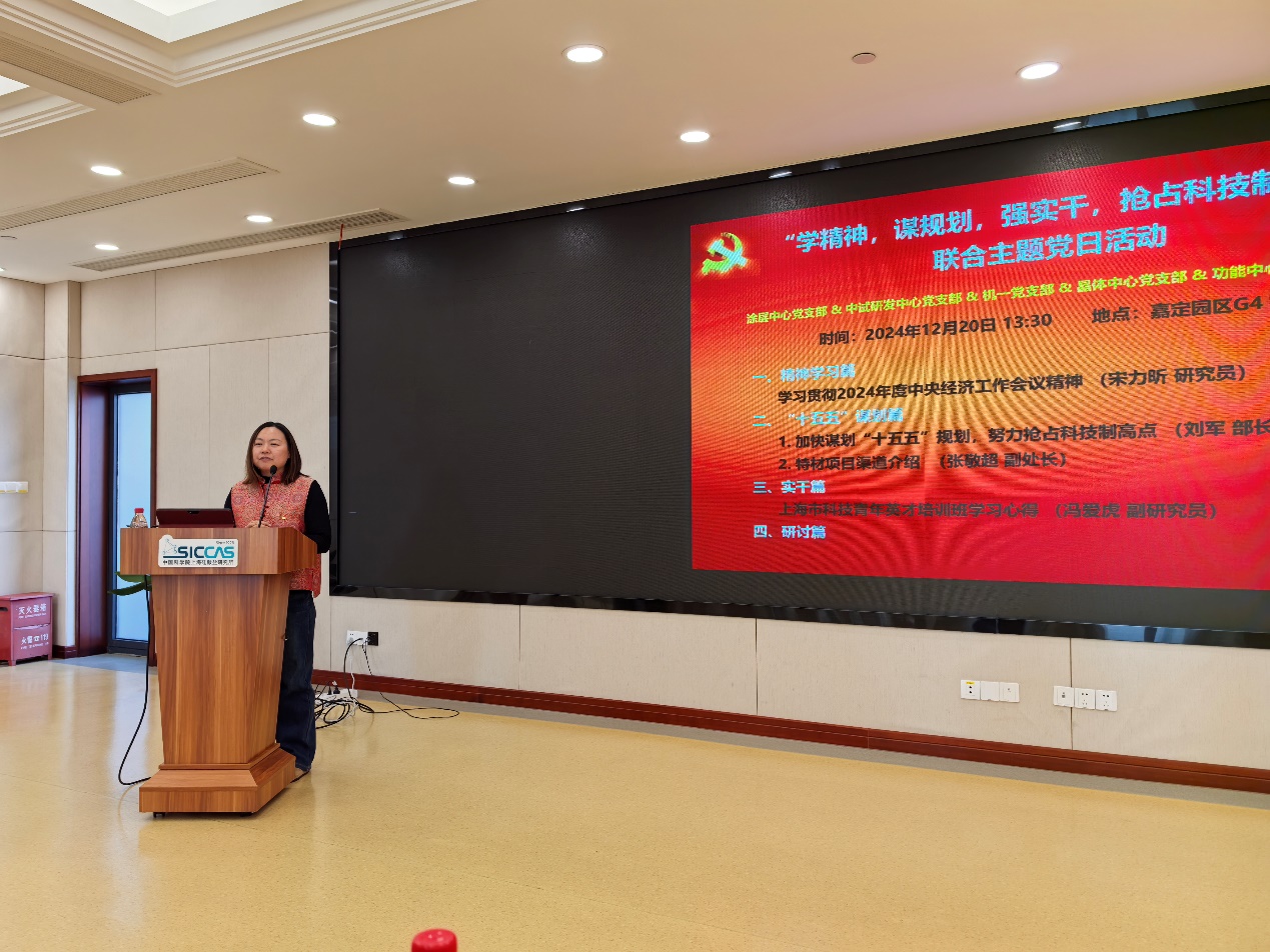 12月20日下午,中国科学院上海硅酸盐研究所特种无机涂层研究中心党支部、信息功能材料与器件研究中心党支部、新材料中试研发中心党支部、机关第一党支部、人工晶体研究中心党支部和无机材料分析与测试中心党支部联合开展“学精神,谋规划,强实干,抢占科技制高点”主题党日活动。党委委员宋力昕,各中心及支部负责人、支部党员等共计100余人参加。活动由特种涂层中心党支部书记孟佳主持。