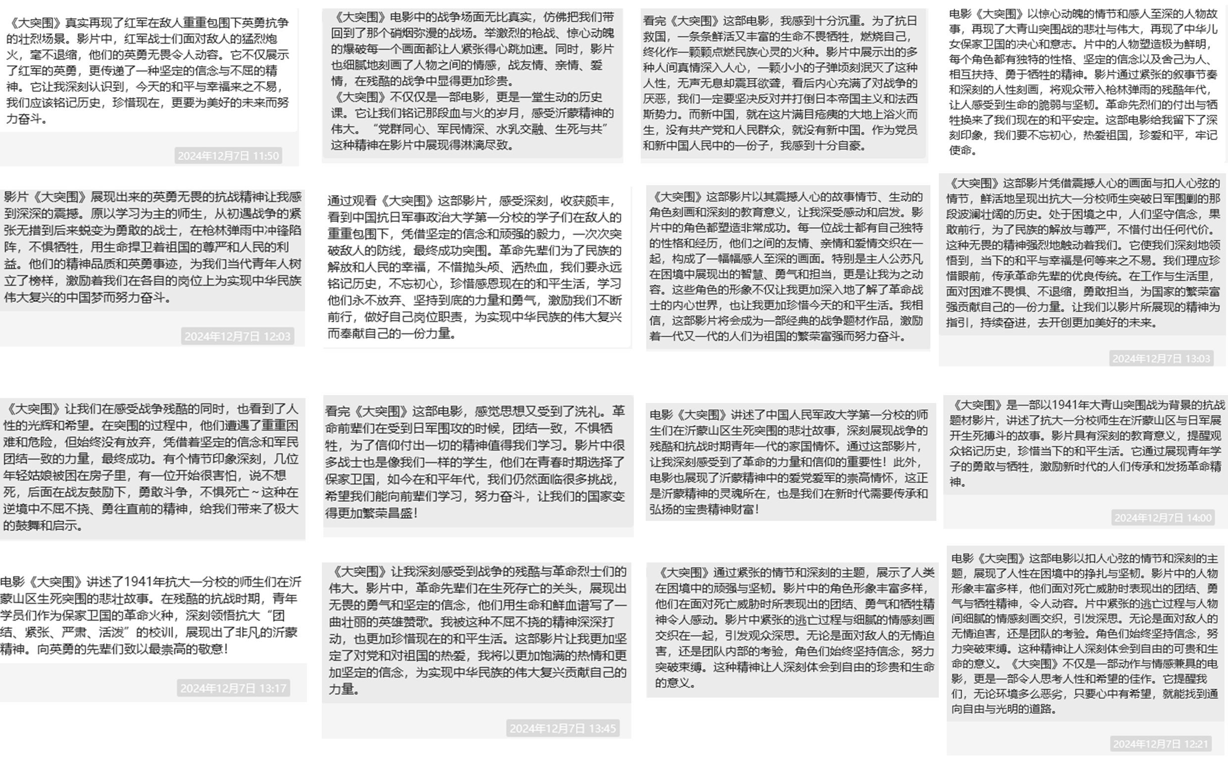 观看电影党课后,支部党员同志们的心情久久不能平静,大家纷纷表达了自己内心的触动和敬意。例如,齐巧艳同志说:“《大突围》真实再现了抗大师生在敌人重重包围下英勇抗争的壮烈场景......他们的英勇无畏令人动容,更传递了一种坚定的信念与不屈的精神。” 李敏悦同志说:“影片《大突围》展现出来的英勇无畏的抗战精神让我感到深深的震撼......勇敢的战士用生命捍卫着祖国的尊严和人民的利益,为我们当代青年人树立了榜样。”明顺熠同志说:“看完《大突围》这部电影,我感到十分沉重。为了抗日救国,一条条鲜活又丰富的生命不畏牺牲,燃烧自己,终化作一颗颗点燃民族心灵的火种......没有共产党就没有新中国。”闫倩倩同志说:“片中的人物都有独特的性格、坚定的信念以及舍己为人、相互扶持、勇于牺牲的精神......革命先烈们的付出与牺牲换来了我们现在的和平安定。我们要不忘初心,热爱祖国,珍爱和平,牢记使命!”等等,不一而足。本次主题党日激发支部党员同志的爱国爱党情怀,树立对未来的奋斗目标,以更加饱满的热情和更加坚定的信念攻坚克难,奋力抢占科技制高点,助力科技强国建设。
