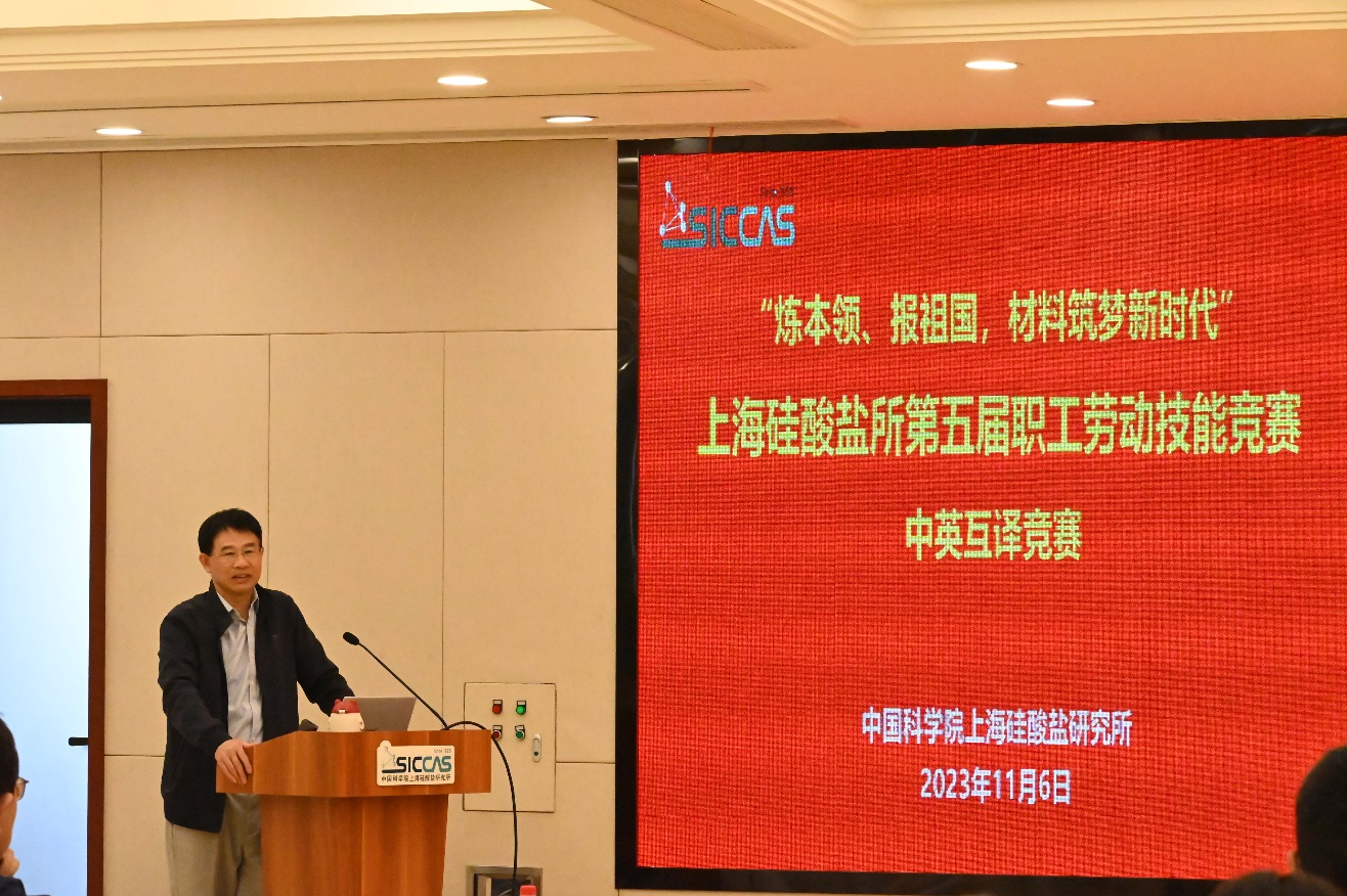 11月6日下午,中国科学院上海硅酸盐研究所举办“炼本领、报祖国,材料筑梦新时代”第五届职工技能竞赛-中英互译比赛。此次活动由所工会主办,无机材料分析测试中心承办。纪委书记、党委委员杨建华,工会主席孙伟嬿以及35名职工参加此次活动。比赛邀请工会副主席、无机材料分析测试中心主任曾毅研究员,人工晶体研究中心副主任吴云涛研究员,生物材料与组织工程研究中心肖浦研究员,党委办公室(所办公室)副主任陆贝妮,以及上一届中英互译冠军得主、高性能陶瓷和超微结构国家重点实验室金锡雄助理研究员担任专家评委。