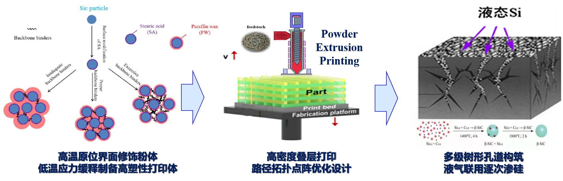 碳化硅(SiC)陶瓷结构件在各类新应用场景的需求正在逐渐增多,其中包括核工业领域的大尺寸复杂形状SiC陶瓷核反应堆芯;集成电路制造关键装备光刻机的SiC陶瓷工件台、导轨、反射镜、陶瓷吸盘、手臂等;新能源锂电池生产配套的中高端精密SiC陶瓷结构件;光伏行业生产用扩散炉配套高端精密SiC陶瓷结构件和电子半导体高端芯片生产制程用精密高纯SiC陶瓷结构件。但是由于SiC 是Si-C键很强的共价键化合物,硬度仅次于金刚石,具有极高的硬度和显著的脆性,精密加工难度大。因此,大尺寸、复杂异形中空结构精密SiC 结构件的制备难度较高,限制了SiC 陶瓷在诸如集成电路这类的高端装备制造领域中的广泛应用,3D打印技术可以有效解决这一难题。3D打印SiC陶瓷制备技术已成为目前SiC陶瓷研究和应用的主要发展方向之一。目前3D打印SiC陶瓷主要为反应烧结SiC陶瓷,大多数密度低于2.95g cm-3,硅含量通常大于30vol%,甚至高达50vol%,由于硅熔点低于1410 ,导致其使用温度较低,大大限制了3D打印SiC陶瓷在半导体领域(如LPCVD)的应用场景。