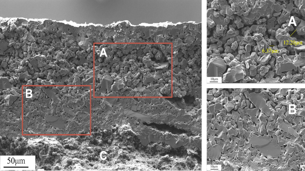 中国科学院上海硅酸盐研究所黄政仁研究员团队陈健研究员在前期提出高温熔融沉积结合反应烧结3D打印SiC陶瓷的基础上(additive manufacturing,2022,58,102944),进一步将陶瓷打印体等效碳密度从0.80 g cm-3提高至接近理论等效碳密度0.91 g cm-3,等效碳密度的增加导致渗硅难度呈指数级提升,直接液相渗硅容易阻塞通道导致渗硅失效。近期研究团队提出了气相与液相渗硅联用逐次渗硅方法,通过气相熔渗反应形成多孔SiC壳层,避免高碳密度的陶瓷打印体在液相渗硅初期发生快速剧烈反应,同时限制液态硅与固体碳的接触面积,这样不会发生熔渗通道的堵塞,使得后续的液相反应能够缓慢且持续地进行。最终制备的SiC陶瓷密度可达3.12 g cm-3,硅含量降低至10vol%左右,抗弯强度和弹性模量分别达到了465MPa和426GPa,力学性能与常压固相烧结SiC陶瓷相当,可以极大提高SiC陶瓷环境使用温度。相关研究成果发表在J. Eur. Ceram. Soc.(doi.org/10.1016/j.jeurceramsoc.2023.09.059),申请中国发明专利2项,其中1项已授权(ZL202211260158.3),论文第一作者为上海硅酸盐所硕士毕业生李凡凡和博士毕业生祝明,通讯作者为陈健研究员和黄政仁研究员。相关研究得到国家重点研发计划、国家自然科学基金面上、上海市自然科学基金面上等项目的资助和支持。