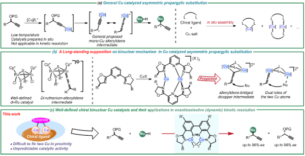 铜催化的不对称炔丙基取代反应能够高效构建手性的炔丙基化合物,在不对称催化中占有重要地位。自van Maarseveen和Nishibayashi等在 2008 年首次报道铜催化的不对称炔丙基胺化反应以来,该领域取得了快速的发展。通常情况下,铜盐和手性配体现场制备铜络合物作为催化剂。该领域中长期以来存在一个假设,就是现场生成了双核的铜中间体,并且它们是反应的活性催化物种。这与一些研究工作中观察到明显的非线性效应相一致,一些原位组装的双核铜物种也确实被分离鉴定。然而,迄今为止,没有结构稳定的双核铜催化的不对称炔丙基取代反应的报道,双核铜催化的机制,依旧是一个未解之谜。