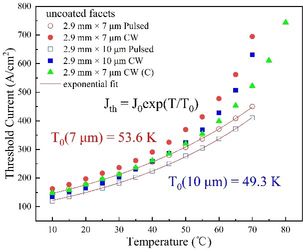图2脉冲模式和连续工作模式下2.9mm腔长、7um脊波导宽度器件与2.9mm腔长、10um脊波导宽度器件的阈值电流密度-温度(Jth-T)关系。