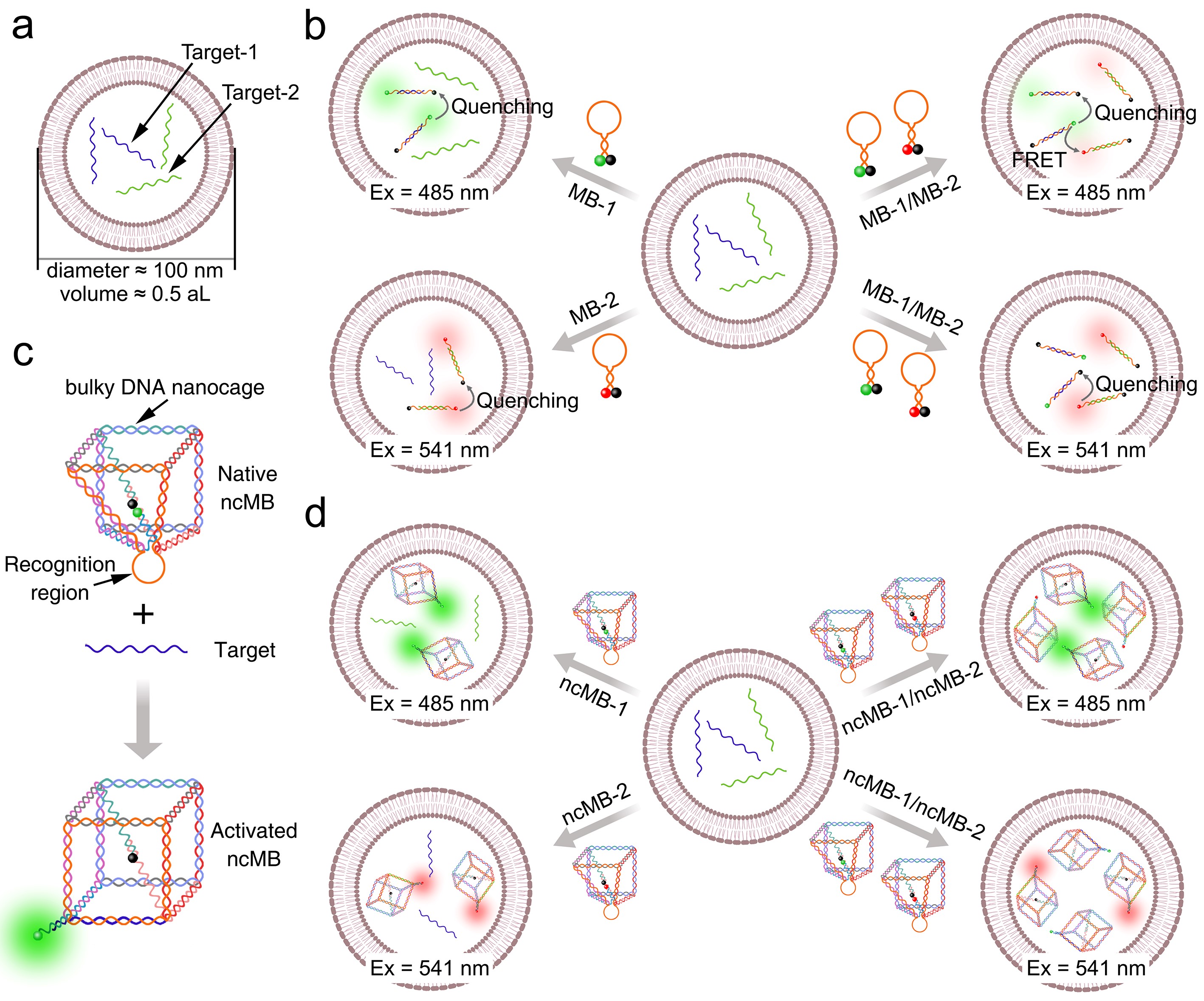 近日,中国科学院微系统与信息技术研究所第八研究室宓现强课题组通过与同济大学、上海大学合作构建了一种结构稳定且高度可编程的立方体DNA纳米笼三维分子信标(Cubic DNA nanocage-based three-dimensional molecular beacon, ncMB)。ncMB独特三维结构产生的空间位阻以及静电斥力构成了荧光探针之间屏障,可消除基于单种分子信标(Molecular beacon, MB)检测时荧光分子与猝灭分子之间非期望的荧光猝灭以及基于多种MB检测时供体荧光分子与受体荧光分子之间非期望的荧光共振能量转移,从而解决信号失真问题。基于优异的抗荧光猝灭与抗荧光共振能量转移性能,ncMB在外泌体检测中获得的荧光信号与传统MB相比可以提高一个数量级。此外,ncMB还具有强大的可编程性和抗干扰能力。因此,ncMB有望成为一种强大而多功能的工具,应用于以外泌体为代表的受限空间内标志物的精准定量分析。
