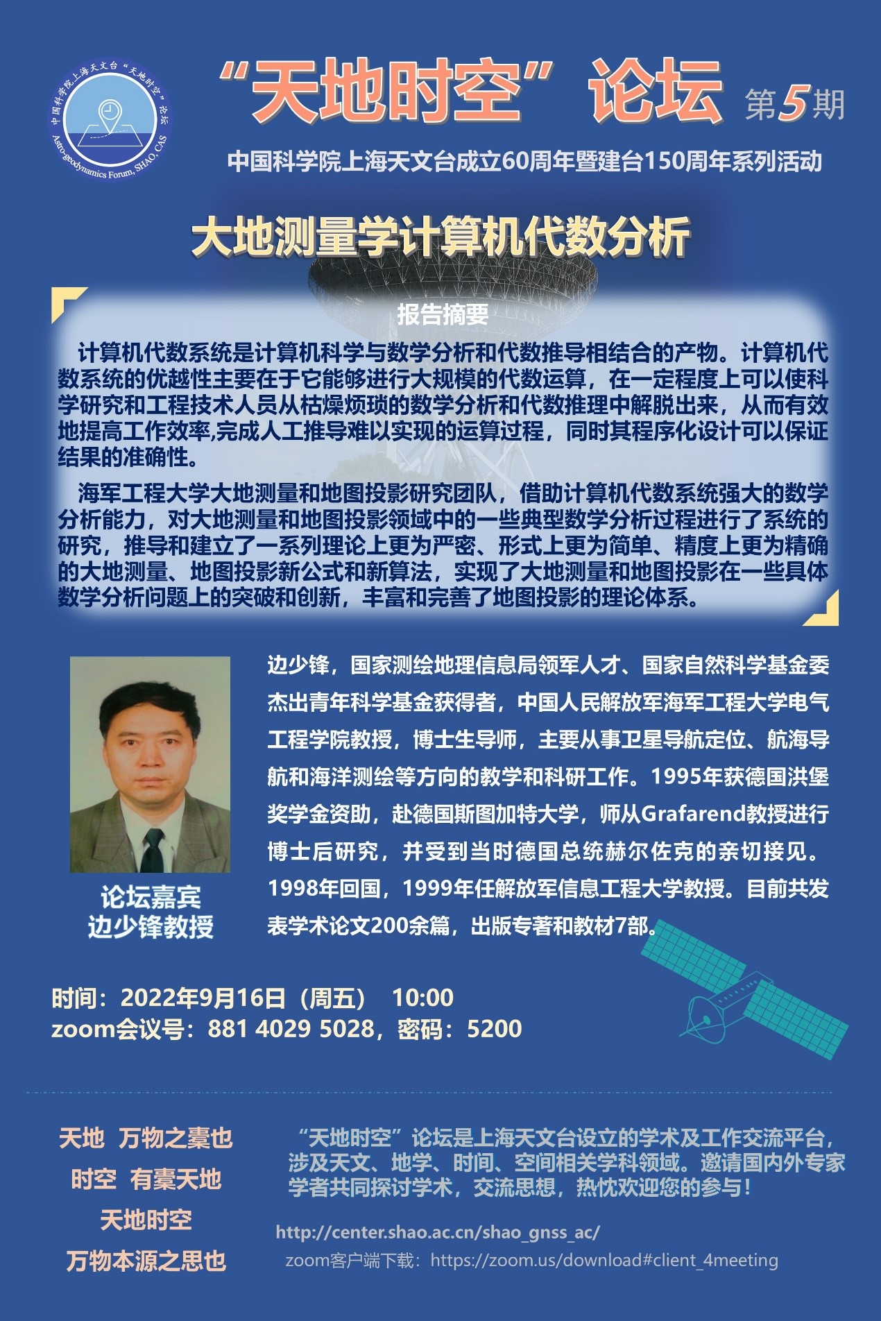 上海天文台于2022年9月16日成功举办第五期“天地时空”论坛。本期论坛是中国科学院上海天文台成立60周年暨建台150周年系列活动之一,论坛邀请了中国人民解放军海军工程大学边少锋教授做了题为《大地测量学计算机代数分析》的学术报告,来自数家单位的百余名科研工作者通过线上和线下结合的方式参会交流。