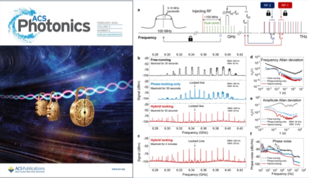 近日,中国科学院上海微系统与信息技术研究所黎华研究员领衔的太赫兹光子学研究团队与华东师范大学曾和平教授、日本东京农工大学张亚副教授合作,在太赫兹(THz)双光梳杂化锁定方面取得研究进展。相关成果于2024年1月5发表在ACS Photonics期刊(Yiran Zhao, Ziping Li, Xuhong Ma, Kang Zhou, Wen Guan, Chenjie Wang, Shumin Wu, Han Liu, Wenjian Wan, J. C. Cao, Ya Zhang, Heping Zeng, and Hua Li, Stabilized Terahertz Quantum Cascade Laser Dual-comb Sources with a Hybrid Locking, ACS Photonics 2024, 11, 520),并被遴选为封面论文。