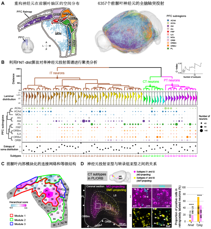 整个过程,是国际上公认的难题。为解决这一问题,严军研究组的苟凌峰博士通过数年的努力攻关,自主开发了以Fast Neurite Tracer (FNT)为代表的TB级光学成像大数据神经元追踪及分析软件,为研究模式动物各脑区的神经联接图谱建立了一套国际领先的研究方法和流程。该研究成功构建了小鼠前额叶单神经元投射图谱,发现了前额叶存在64个神经元投射亚型和前额叶内部连接存在模块和等级结构,为理解前额叶的工作机制提供了线索。其中,单个转录组亚型对应多个投射亚型这一规律,进一步突显出了单神经元投射图谱对于神经元分类的重要性。