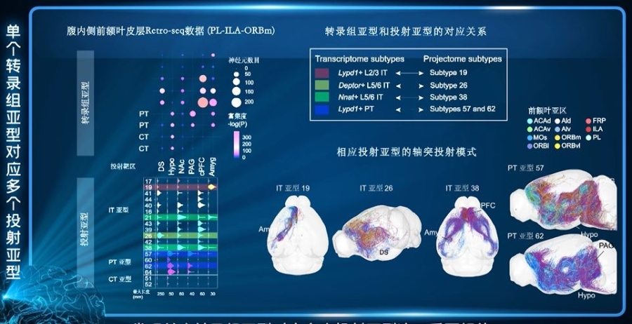 “我们首次发现,小鼠前额叶皮层中存在64类神经元投射亚型,并绘制出了这些神经元亚型在前额叶亚区的分布和皮层深浅层的分布。”严军介绍,通过建立高空间分辨率的前额叶内部连接网络,研究团队发现,前额叶内部连接网络具有模块化的性质和等级结构。
