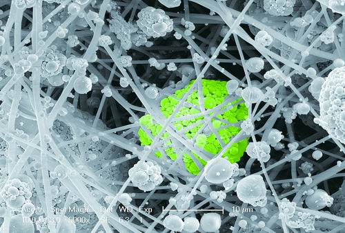 电子显微镜下的静电纺丝和静电喷雾原位组装复合材料。该图曾在宁波市“以物观物——在材料艺术与科学图像之间”展览上展出。曹晋玮/摄