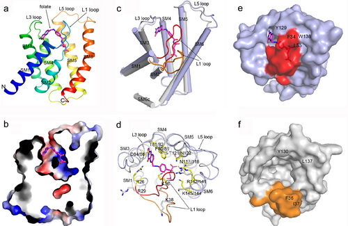 (a)EfFolT的整体结构,叶酸用洋红色棍棒模型表示;(b)横截面图显示叶酸在FolT上的结合位点;(c)叶酸结合状态(EfFolT-蓝色,L1 loop呈关闭状态)和释放状态(LbFolT-灰色, L1 loop呈开放状态)的结构叠合比较图,L1 loop分别用红色和橙色表示;(d)c图的顶端俯视图显示与叶酸结合的氨基酸残基和构象变化;(e)处于L1关闭状态时叶酸结合位点俯视图;(f)处于L1开放状态时叶酸结合位点俯视图。
