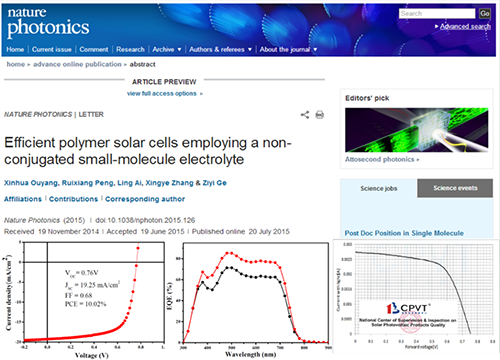7月20日,国际顶级学术期刊Nature Photonics以“Efficient polymer solar cells employing a non-conjugated small-molecule electrolyte”为题,报道了中科院宁波材料所有机光电材料与器件团队在有机太阳电池领域取得的重要研究进展(Nature Photonics, Year published:2015, 9, 520–524. DOI: doi:10.1038/nphoton.2015.126)。
