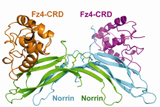 尽管与Wnt的结构不尽相同,Norrin可以特异性地结合Wnt的受体Fz4,并激活经典的Wnt/beta-catenin通路。然而,Norrin如何与Fz4结合并激活Wnt/beta-catenin通路的机理仍然未知。2013年徐华强研究团队解析了Norrin的晶体结构(Genes &Dev, cover article, 2013),在前期工作的基础上,徐华强研究员与华盛顿大学许文清教授课题组合作进一步解析了Norrin-Fz4-CRD复合物的晶体结构。