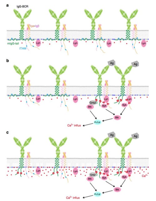 记忆性免疫应答在保护机体抵御病原体的过程中发挥着重要作用,记忆性B淋巴细胞为其重要组成部分,同时也是几乎所有现行疫苗发挥作用的免疫学基础。相比于初始型B细胞的IgM型抗原受体介导的初次抗体反应,记忆性抗体反应能够快速产生大量高亲和力的抗体。这种增强性的免疫应答依赖于记忆性B细胞的IgG型抗原受体在识别抗原后启动的更快速、更高效的跨膜信号转导。该论文通过对B淋巴细胞抗原受体复合体各个亚基的胞内区氨基酸序列进行分析发现,膜联IgG重链胞内区(mIgG-Tail)含有较多的碱性氨基酸和疏水氨基酸,整体呈正电性;而细胞质膜内膜因含有较多的酸性磷脂而呈现出负电性,利用活细胞成像和核磁共振(NMR)等研究手段,该论文证实静息态B细胞中mIgG-Tail与细胞质膜酸性磷脂互作,从而使得mIgG-Tail中的核心酪氨酸位点被有效地保护在细胞质膜中。外来抗原的免疫识别驱动抗原受体的mIgG-Tail从细胞质膜上解离下来,暴露的mIgG-Tail酪氨酸位点继而被磷酸化,并以正反馈的方式增强跨膜信号转导过程中的Ca2+信号,从而保证记忆性B淋巴细胞快速高效免疫活化的有序起始。更有趣的是,该论文发现mIgG-Tail与细胞质膜的有效解离依赖于抗原识别后胞外大量Ca2+快速进入细胞对细胞质膜中的酸性磷脂的竞争性结合。该研究成果为记忆性B淋巴细胞的免疫识别、免疫活化和免疫调节提供了新的分子机制,对帮助人们深入理解抗体的免疫记忆,从而在新视野下对疫苗研究、相关疾病如自身免疫病、B细胞淋巴瘤的致病机理、以及药物开发等提供新的理论依据。
