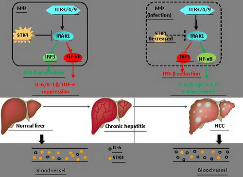 在外界细菌感染的情况下,巨噬细胞中STK4表达降低,引起IRAK1不能被磷酸化降解而持续性活化下游的NF-κB信号通路,并抑制IRF-3活化,最终导致炎症因子上调和 IFN-β表达下降,进一步促进炎性肝癌发生发展的过程。