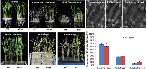 该研究组在前期研究中鉴定到一个控制水稻抗旱耐盐的重要转录因子DST (Drought and Salt Tolerance)(Huang et al., Genes & Development,2009, 23: 1805–1817)。为了进一步完善DST的抗逆调控机制,该研究组博士生崔龙岗等通过酵母双杂交技术寻找参与DST抗逆机制的新成员,发现了DST Co-Activator 1 (DCA1),其是一个功能未知的CHY锌指蛋白。当过量表达DCA1时使转基因水稻植株对盐、旱胁迫变得更敏感,而该基因的突变体dca1却明显增强水稻对盐、旱胁迫的耐受性,表明DCA1是一个抗逆负调控因子。通过进一步研究证明DCA1对DST的转录活性具有促进作用,并且过量表达DCA1可以增加气孔开度而dca1可以降低气孔开度,这种调控气孔的开度是通过调节H2O2的量而实现的,DCA1与DST可能形成异源四聚体行使调节H2O2的功能。这些研究结果为作物抗逆机理的深入研究提供新线索,并且为作物抗逆性(抗旱和耐盐)的分子育种提供有价值的基因专利。