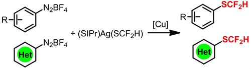 同时,沈其龙课题组还开发出了第一个亲核的二氟甲硫基试剂[(SIPr)Ag(SCF2H)]。该试剂同样对水、空气稳定,在铜盐的作用下,可以与芳基或杂芳基重氮盐发生Sandmeyer类型的脱氮气二氟甲硫基化反应。该反应条件温和,兼容常见的官能团,为有机小分子中引入二氟甲硫基提供了一个新思路(Angew. Chem. Int. Ed. 2015, 54, 7648)。