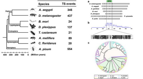 针对这一系列重要问题,李轩课题组的博士生孔艺萌等基于前期建立的高通量转录组数据分析平台,从组学和进化的角度对反式剪接基因进行了系统性研究。通过收集分析昆虫纲五个目八个物种的组学大数据,研究人员一共发现了1627个反式剪接事件,涉及2199个基因(占基因总数的1.58%),说明反式剪接对物种转录组产生较小规模的影响。通过对反式剪接基因特征的分析,发现其与顺式剪接具有即相似又不同的特征。除了发现一大批之前没有报道过的基因反式剪接事件,研究人员发现mod(mdg4)是昆虫纲中唯一保守的反式剪接事件。它起源于双翅目和鳞翅目物种的共同祖先,在果蝇和蚊子分离后发生了基因结构的巨大变迁,并经历了反式剪接exon的大规模复制扩增。这一方面证明了反式剪接在基因功能多样化中的作用,又否定了反式剪接仅仅是剪接噪音的假说。同时,这些结果也说明反式剪接在进化中受到了严格的调控,其导致基因多样化的功能并没有被广泛利用。令人意外的是,研究人员进一步发现了146个反式剪接产物与其他物种基因的顺式剪接产物高度相似,揭示了反式剪接在维持断裂基因结构方面发挥的特殊功能。这一发现暗示反式剪接通过改变对基因结构的限制,在基因和基因组的进化过程中有着特殊作用和重要的意义。