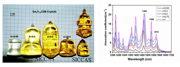 图1. 生长制备的不同Sm3+掺杂量的SmxY1-xCOB晶体(左图)及其对应1572nm附近的近红外吸收光谱(右图)