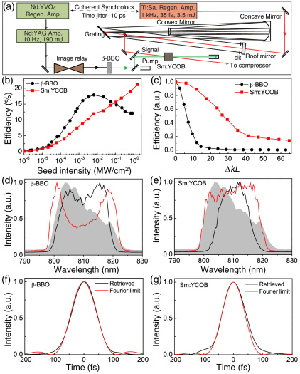 图2. 激光实验装置原理图及采用Sm:YCOB与BBO晶体分别实现QPA和OPA在转换效率、相位失配容许、输出光波形、压缩脉宽等方面的对比