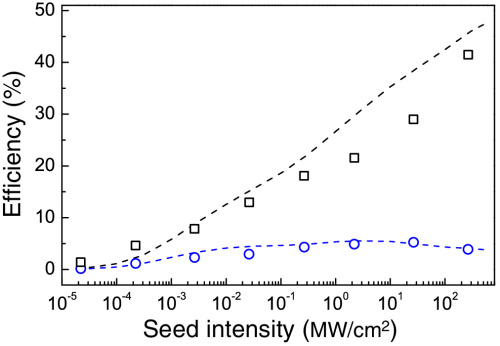 图3. QPA过程中信号光(正方形)和闲频光(圆形)转换效率测试结果