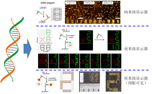 上海应用物理所柳华杰、樊春海等研究人员与Kurt Gothelf教授合作,提出了基于组合学原理建立类似“查找表”的全新DNA计算模式,显著提高了DNA计算的效率。在计算机科学中,使用查找表可以避免复杂运算过程中的多级逻辑运算。DNA构建的查找表具有超大的变量容纳能力。例如,8个碱基的DNA序列理论上具有48=65,536种编码形式。而利用DNA强大的平行计算能力则可以高效地访问查找表。研究人员以乘法运算为例对该模式进行了演示,并采用了类似电子计算器的可视化数字输出形式。运算结果以明确的数字结果在多尺度的显示器上均可以得到解读。这一DNA计算模型具有模块化设计的特点,有望通过设计人性化的输入、计算、输出等模块,成为一种适合于普通用户的原型DNA计算机,并在生物传感、数据存储与处理等方面得到应用。