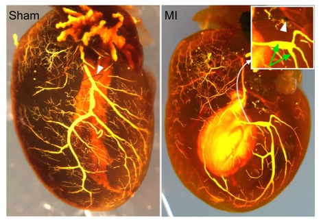 小鼠心脏冠状血管造影图(白色箭头表示结扎点,绿色箭号表示新形成的侧枝动脉)。
