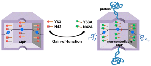上海药物所杨财广课题组前期合作研究描述了金黄色葡萄球菌ClpP蛋白酶的晶体结构以及分子动力学基础(J. Biol. Chem. 2013, 288, 17643-17653; J. Biol. Chem. 2011, 286, 37590-37601)。该研究成功设计并充分表征了具有功能获得性自激活的ClpP突变体ClpPN42AY63A,从分子机制和表型上,突变体的特征与ADEP紊乱激动ClpP水解酶的特征极其相似。首先研究表征了突变体蛋白质的生化活性、聚集状态及热稳定性,揭示Tyr63对于ClpP功能激动起到启动开关的作用。其次,解析了ClpPY63A突变体的晶体结构,发现具有多米诺效应的Asn42在功能激动中发挥促进增强的作用。