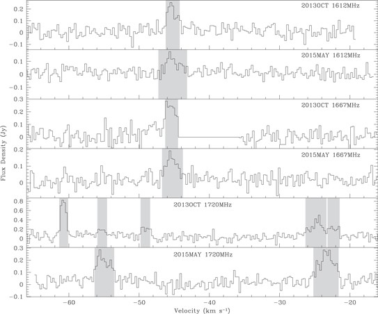 2013年10月和2015年5月观测的该源(IRAS 16333-4807)在1612, 1667和1720兆赫兹OH脉泽谱线,阴影部分是谱线发射通道,X轴是速度,Y轴是流量。