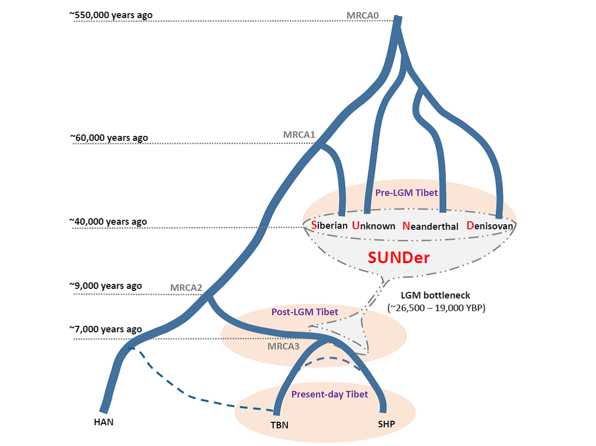 (3)早期进入青藏高原的人类不是一个单一的族群,甚至不是一个物种。他们最初也许不是青藏高原的永久性居民,很可能是一些采摘狩猎族群(Hunter-gatherer),只是到一定季节才到高原上采集或猎取食物。这些人类族群包括旧石器时代的现代智人——在遗传上与已灭绝的古西伯利亚现代智人有近缘关系,也有早期智人——可能有多个支系,包括考古学已经发现的阿尔泰尼安德特人和丹尼索瓦人,以及其他未知古人类。并且这些早期进入青藏高原的人类族群间发生了广泛的基因交流,形成了一个包含现代智人和早期智人多个谱系的遗传构成极其复杂的混合人群(文中称之为SUNDer)。