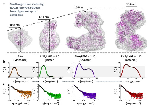 荧光光谱学测试表明,这一探针体系可对PNA产生选择性的荧光增强。为解析上述糖基折叠体与生物标志物的作用模式,研究人员进一步与国家蛋白质科学研究(上海)设施BL19U2线站的李娜博士合作,利用生物小角X-射线散射(SAXS)技术证实了这一折叠体可通过与PNA的相互作用解折叠,进而通过芘的分子间堆叠作用形成探针/凝集素超分子交联体。基于这一牢固的交联作用,还实现了糖基折叠体对ASGPr的细胞水平标记,发现此类探针可用于高表达ASGPr的肝癌细胞靶向荧光成像,而几乎不对一系列不表达此受体的对照细胞产生标记效应,进一步发现探针可用于示踪ASGPr的内吞过程,可准确定位受体在早期内涵体、晚期内涵体、循环内涵体及溶酶体的转位、更新等生命过程。