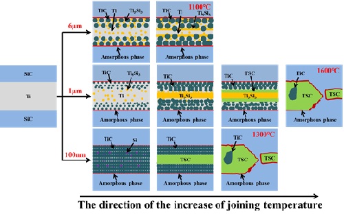 Scheme 1 Phase evolution process with the increase of joining temperature in SiC/Ti system with varied thickness of interlayers.