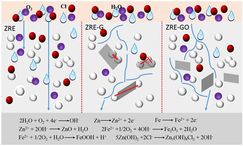 中国科学院宁波材料技术与工程研究所海洋功能材料团队通过Hummers法和还原反应制备了具有高电导率的还原氧化石墨烯(rGO)和低电导率的氧化石墨烯(GO),系统研究了rGO、GO和rGO/GO改性环氧富锌(ZRE)复合涂层的腐蚀防护行为。结果表明,与ZRE涂层相比,在加入rGO后ZRE涂层的阴极保护时间和物理阻隔性能均大幅提升,ZRE-rGO涂层表现出最佳的防腐性能。一方面,rGO显著改善了锌颗粒与基体的电接触,最大限度地发挥了锌颗粒的作用;另一方面,rGO同样具有优异的物理阻隔特性,大大延长了腐蚀介质的扩散路径,从而提高了复合涂层的腐蚀保护寿命。相关研究结果发表在Materials and Design, 2019, 169, 107694。