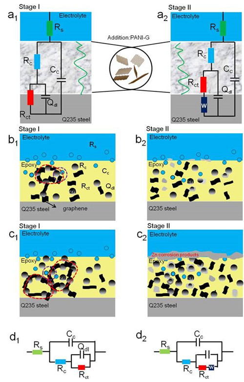 图2 石墨烯改性环氧富锌涂层的微观腐蚀作用机制及不同腐蚀阶段的等效电路图