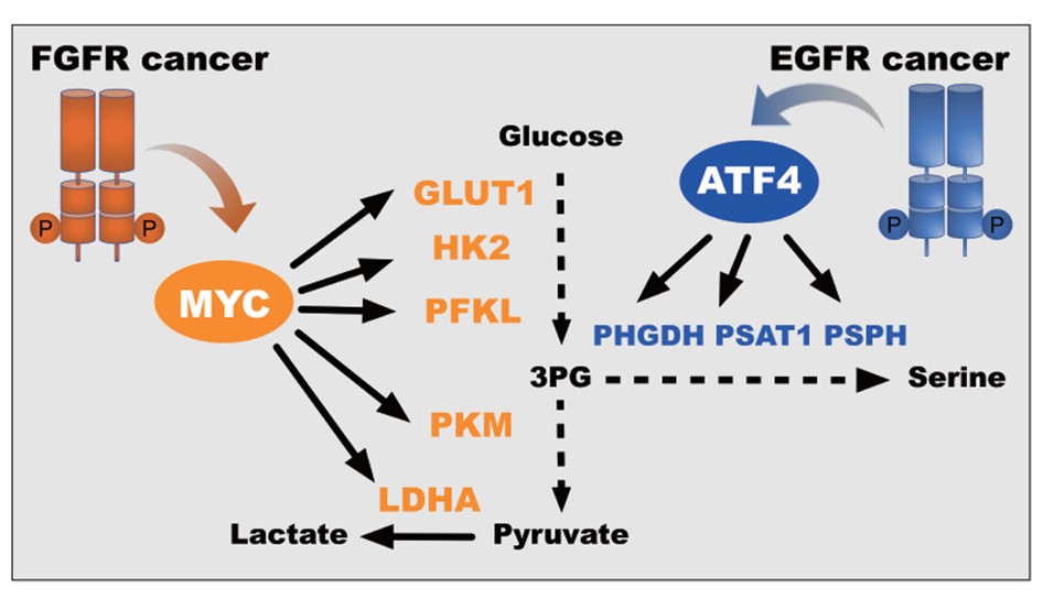 中国科学院上海药物研究所黄敏研究员近年来致力于探索肿瘤代谢抑制剂研发,前期发现了一系列代谢酶抑制剂及相关的用药方案。在代谢抑制剂研发的过程中,面对代谢抑制剂敏感群体不明的治疗困境,提出了从临床现有的分子分型入手,建立癌基因与代谢依赖性关系的研究策略。与厦门大学林树海教授合作,团队聚焦分子分型清晰的非小细胞肺癌,从受体酪氨酸激酶(Receptor tyrosine kinase,RTK)入手,综合运用多种稳定同位素标记的代谢组学和转录组学技术,阐明了不同RTK驱动肿瘤的代谢依赖性及其转录调控的分子机制,系统证实了EGFR突变和FGFR扩增驱动肿瘤的代谢弱点。其中,EGFR突变肿瘤高度依赖丝氨酸合成通路,而FGFR扩增肿瘤依赖乳酸合成。研究还利用人源肿瘤组织来源移植瘤PDX模型,证实了EGFR突变和FGFR扩增作为丝氨酸代谢和乳酸合成抑制剂敏感标志物的可行性,为同类代谢抑制剂的个性化治疗提供了重要信息,为代谢抑制剂敏感群体研究提供了新的思路。