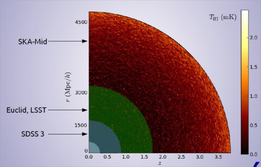 氢元素占宇宙普通物质总量的76%,分布十分广泛,通过观测宇宙氢原子产生的谱线即中性氢巡天,SKA可以绘制出不同时期的宇宙三维图像,从而展示宇宙中的物质是怎样在引力作用下从早期的均匀分布逐渐演化形成非均匀的星系大尺度结构。而通过对大尺度结构的精密测量,又可以分析暗物质和暗能量的性质,以及宇宙早期初始状态的信息。此外,在这种大面积的巡天中也可以探测到大量宇宙射电源,对其分布的统计分析也可以为宇宙学研究提供宝贵的数据。